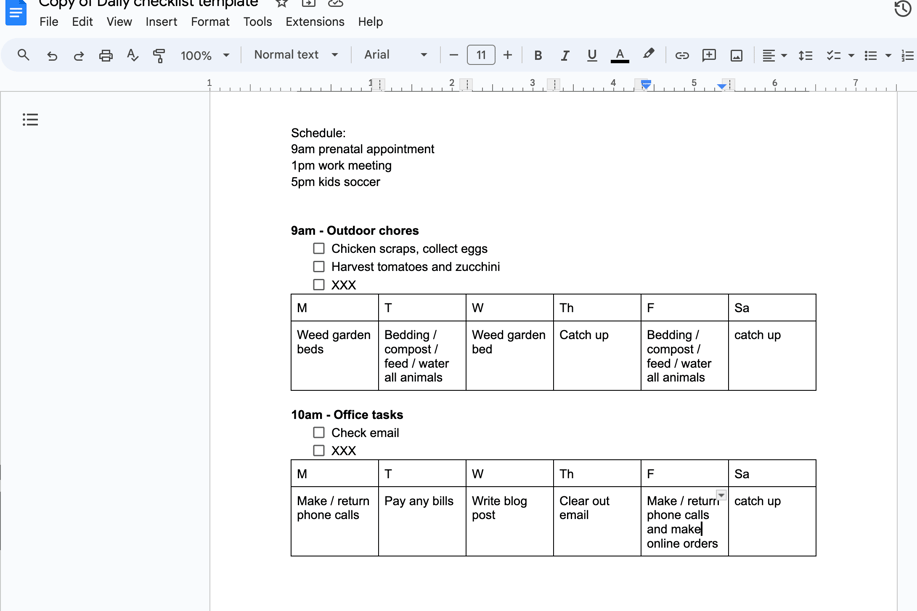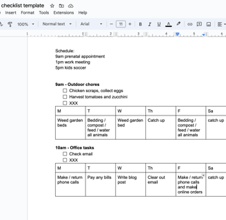 My other favorite set up tool is to insert a table for rotational items through the week (on my template that I copy forward from). Garden tasks, Animal chores, Decluttering / deep cleaning by room, homeschool subjects, meal plan, etc. That way I can select from the day and copy and paste it onto my checklist (Tuesday weeding the garden beds, for example) and delete the table from that day's list (or it'll be long and cluttered). This makes it easy to track what needs to be done while also being flexible (maybe I have time for Wednesdays task but not Tuesdays, so I pull from Wednesdays task instead and will remember the next day to swap.