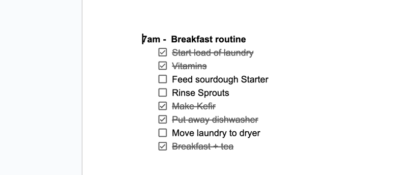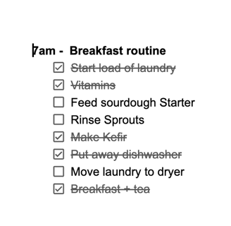 Keep it Simple: Overloading your list can be overwhelming. Don't put items you'll effortlessly remember without the list (for early morning I have feeding the fish and putting laundry away so I don't forget but don't list getting dressed or brushing my teeth so I'll do that anyway).