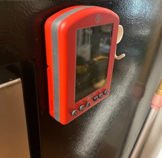 The battery powered receiver has a radio range that’s much better than blue tooth, especially through walls, so when I leave the room the monitor will still tell me when my meat is done (hello short attention span!).